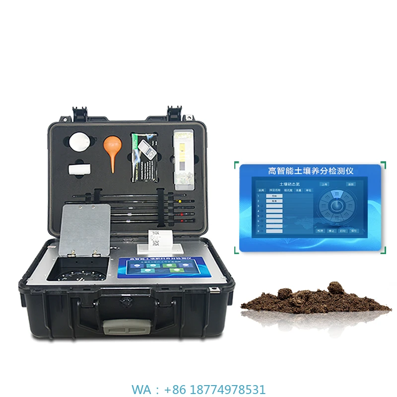 The kit includes the main analyzer and accessories needed for routine testing, packaged for portability and protection. Results assist in assessing soil health trends, adjusting nutrient applications, and optimizing irrigation practices. Suitable for general agricultural and horticultural use.