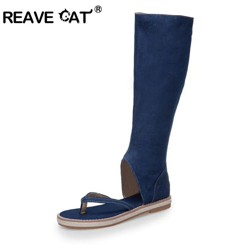 REAVE CAT shoes clip toe sandals blue jeans flat shoes women summer gladiator booties sandalias mujer size 43