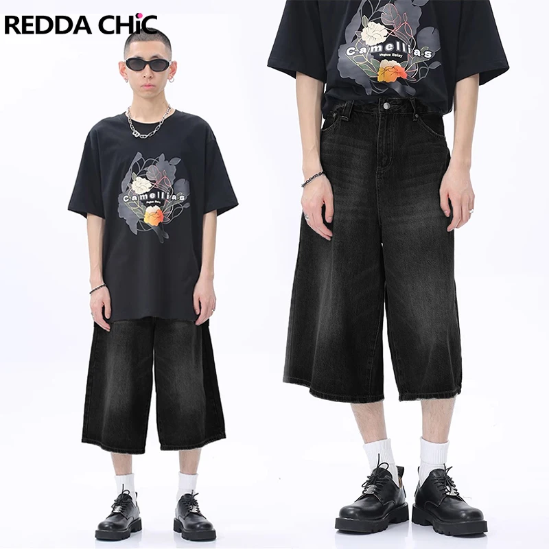 ReddaChic Acubi Fashion Brushed Baggy Jorts Men Vintage Black Raw Edge Loose Casual Denim Shorts Y2k Hiphop Wide Leg Short Pants