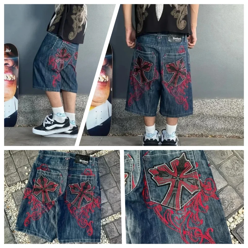 Retro Y2K Neo-Gothic Oversized Cross Pattern Printed Loose Denim Shorts bring vintage-inspired streetwear to your everyday rotation. These high-waisted, wide-leg shorts feature a bold cross pattern print for a distinctive neo-gothic aesthetic. The relaxed, oversized fit offers breathable comfort and effortless movement, making them ideal for casual outings and layered looks.