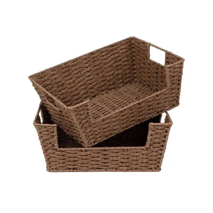Keep shelves neat and accessible with this 2-pack of round paper rope woven baskets, designed for pantry organizers and general storage. The neutral brown tone blends with a variety of décors while the woven paper rope construction provides a breathable, lightweight option for holding dry goods, napkins, spice jars, snacks, and other kitchen essentials. Their stackable design helps maximize vertical shelf space, making them ideal for tight pantries, cupboards, or open shelving.