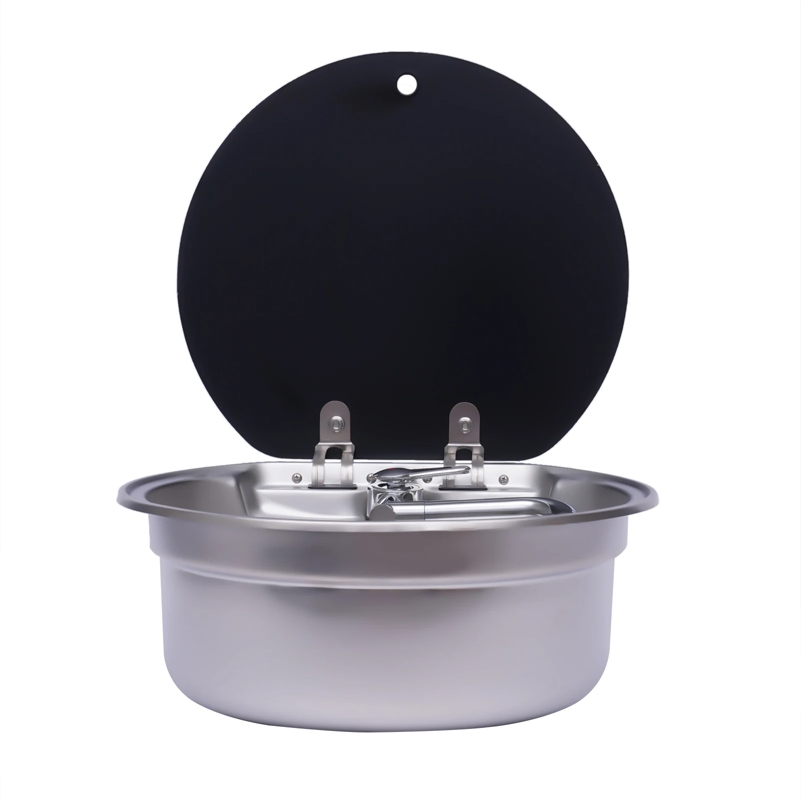 Compact and resilient, the Round RV Sink with 304 stainless steel construction is designed for camper vans, boats, and other small living spaces. The included tempered glass cover provides a clean work surface when the sink is not in use, while the efficient drainage system helps prevent standing water. A soundproof pad reduces noise during use, making it suitable for mobile environments.