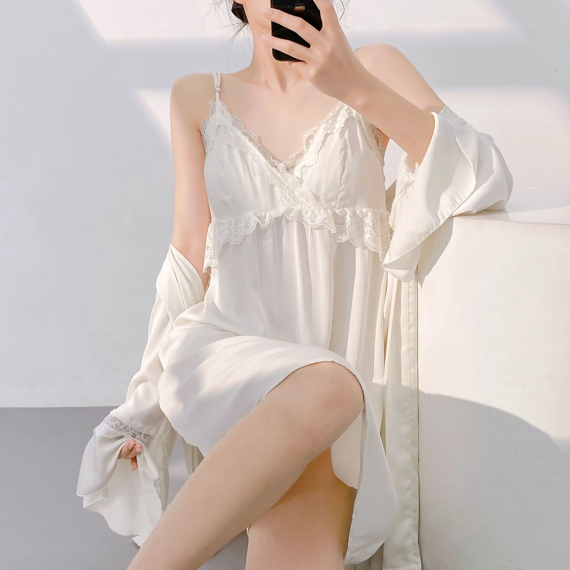 Delicate and alluring, the Sexy Bride Bridesmaid Wedding Robe & Gown Set blends romantic lace with soft, lightweight fabrics for an intimate bedtime look. Designed for spring and summer wear, the set features a lace-trimmed suspender nightgown paired with a coordinating robe that’s easy to layer for getting-ready moments, a bridal party, or relaxed evenings at home. The silhouette is flattering yet understated, making it suitable for a range of occasions from honeymoon nights to bridesmaid gifting.