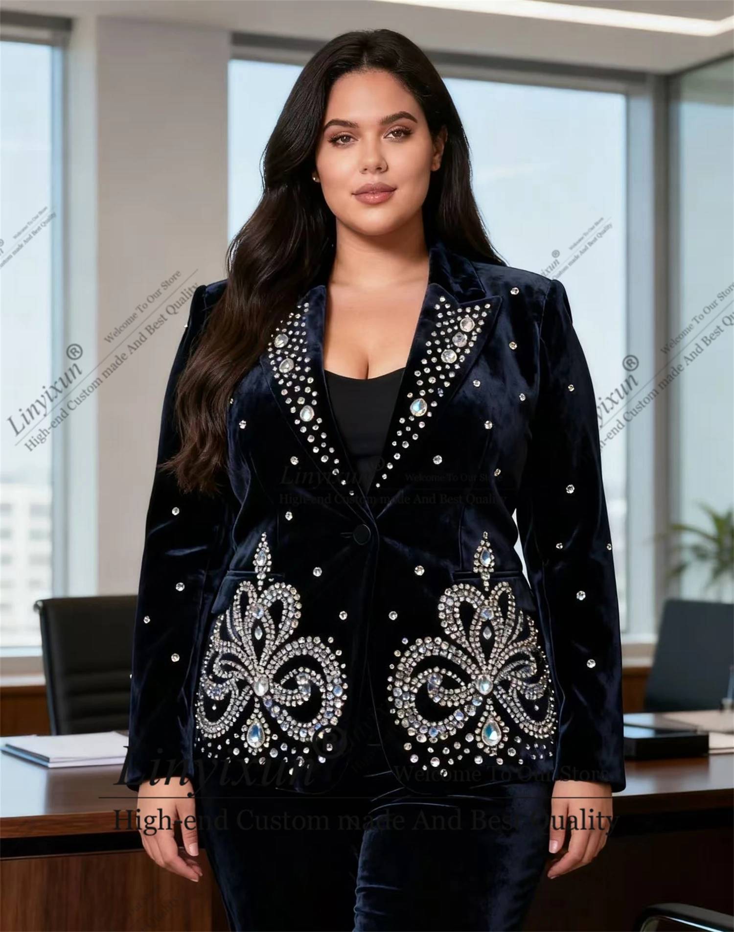 Elevate your evening wardrobe with the Shiny Temperament Of Bride Dresses Velvet Customized Luxury Breasted Women Suits. This tailored women’s blazer blends velvet softness with a structured, luxury-inspired silhouette—ideal for banquets, parties, or formal events. Clean lines and a double-breasted front create a polished look that pairs beautifully with tailored trousers or a sleek skirt for a complete tuxedo-style outfit.