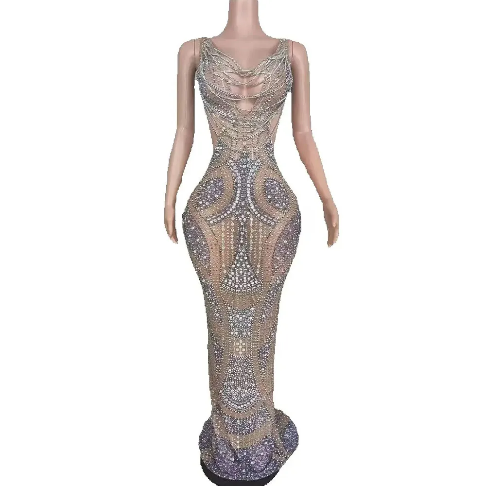 Shimmer under the lights in this Sparkly Rhinestones V-Neck Chains Backless Long Dress. Designed for evening events, prom, performances, or special birthdays, the dress combines a deep V-neck with delicate chain details and a daring backless silhouette. Sheer panels create a see-through effect that balances sultry allure with elegant lines, while scattered rhinestones catch light for subtle sparkle as you move.