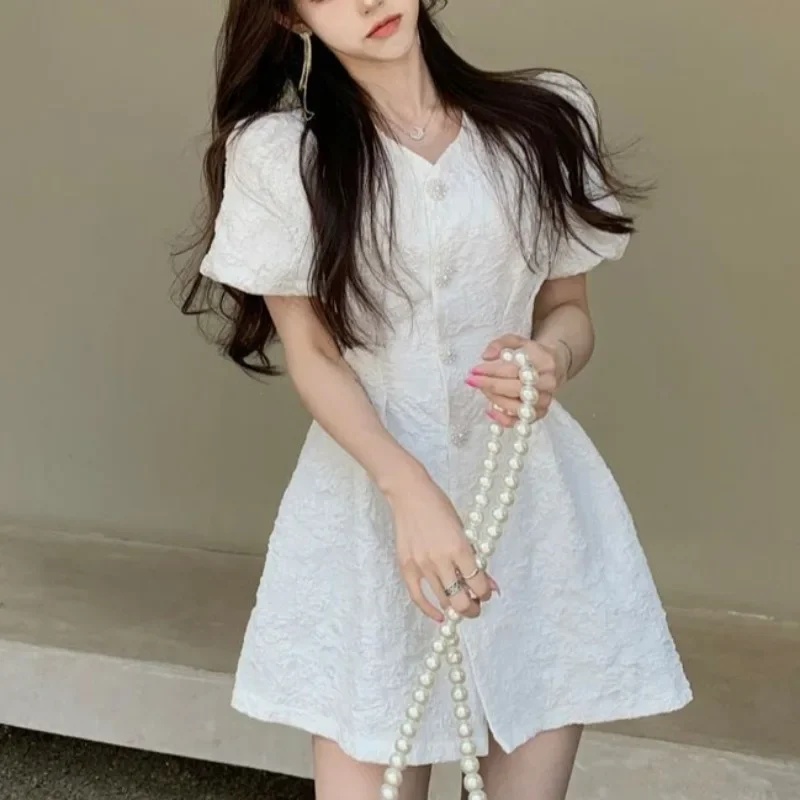 Float into warm-weather days with this Spring Summer Fresh White Floral Short Dress. Designed with a clean, single-breasted front and flattering mini length, it blends youthful charm with elegant French-inspired details. Soft puff sleeves add a romantic silhouette while the lightweight feel keeps the dress comfortable for daytime outings, garden parties, or casual gatherings.