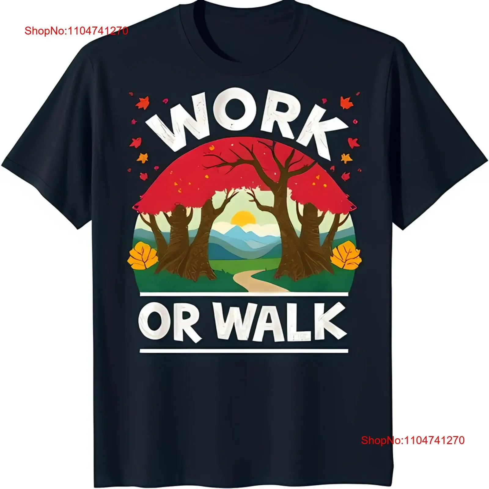 This stylish black T-shirt blends casual comfort with a distinctive vintage-washed look. The front features a subtle “Work or Walk” slogan paired with an autumn forest graphic, creating an easygoing yet thoughtful design that works well for relaxed office environments, weekend outings, or layered looks. The breathable fabric keeps you comfortable throughout the day while the slightly versatile cut complements various styles without feeling restrictive.
