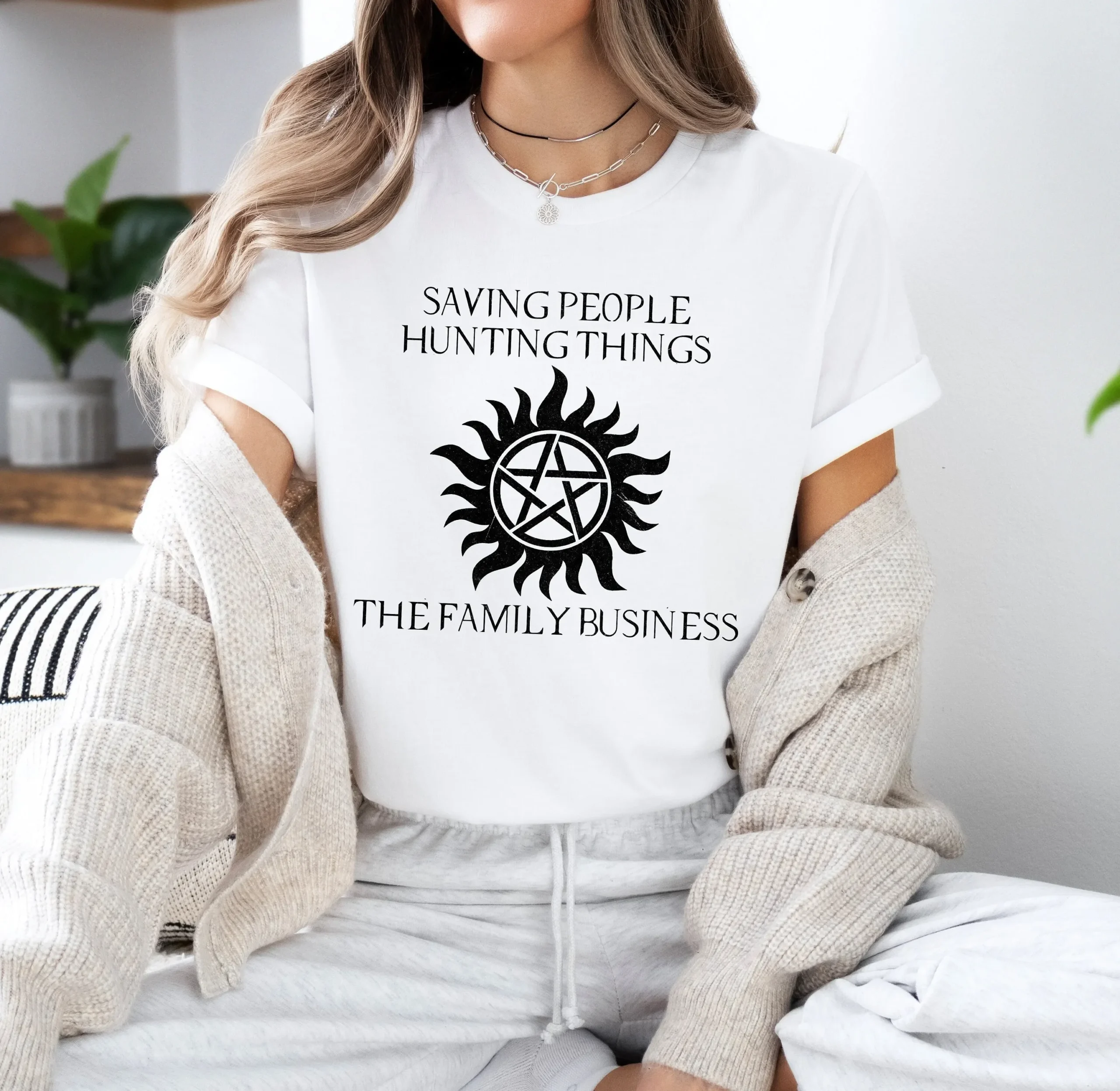 Show your love for paranormal adventures with the Supernatural Family Business T-Shirt. This casual tee blends fandom style with everyday wear—perfect for Halloween events, conventions, or just a laid-back day. The anti-possession motif gives a bold, recognizable look while keeping the design versatile enough to pair with jeans or layered under a jacket.