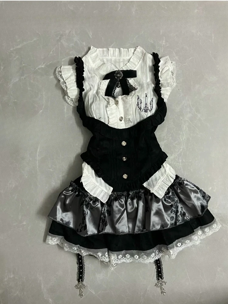 Be the first to review “Sweet College Style New Suit Girl Kawaii Design Sleeveless Top Vest Puffy Cake Mini Skirt Lace 3 Piece Set Women Fashion Outfits”