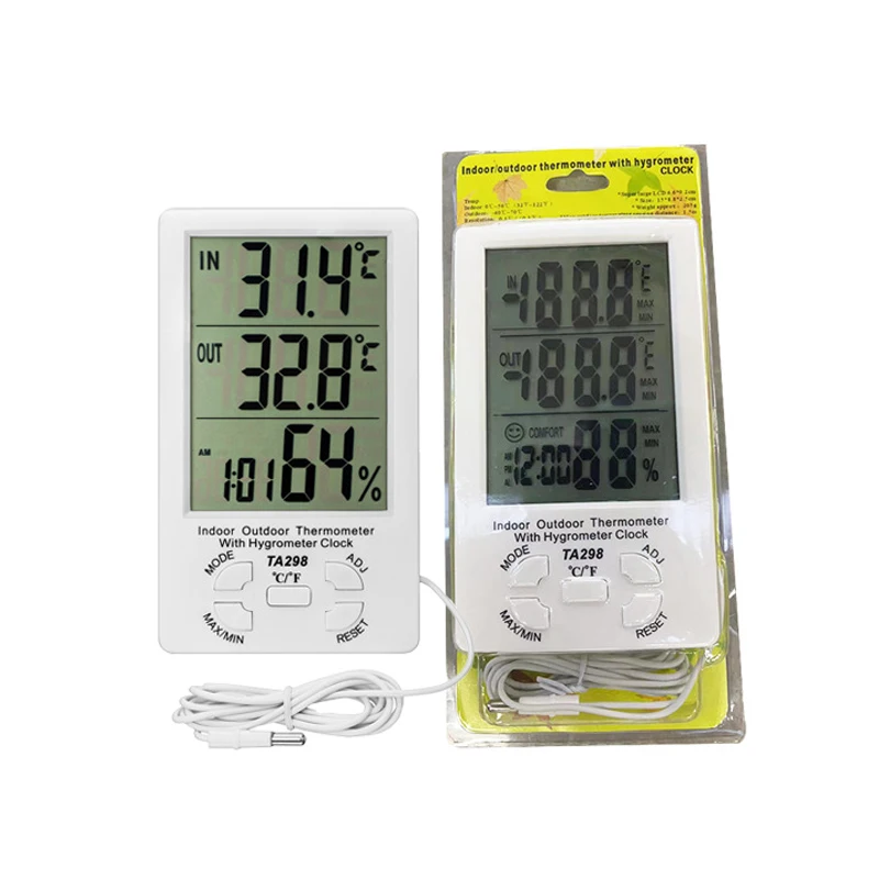Compact and versatile, the TA298 Large Screen Digital Display Thermometer Hygrometer Clock combines clear timekeeping with temperature and humidity monitoring for indoor and outdoor use. The large, easy-to-read display shows temperature in Celsius or Fahrenheit, humidity percentage, and time on one panel—ideal for living rooms, garages, greenhouses, offices, or entryways where quick environmental checks are useful.