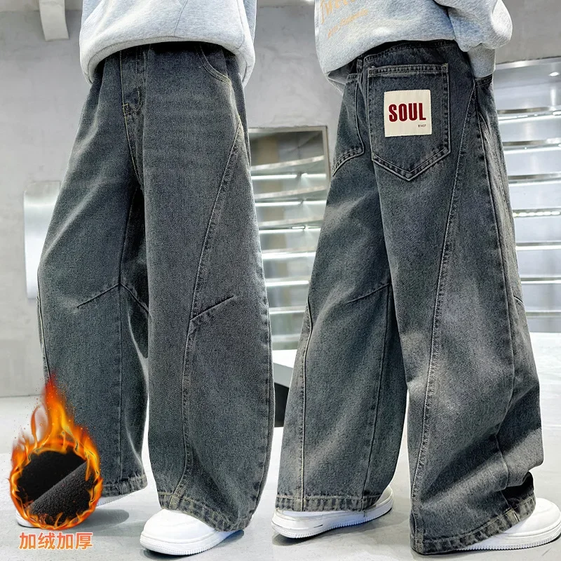 Teen Boys Denim Pants Autumn and Winter New Large Children Thick Velvet Wide Leg Jeans Boys Retro American Straight Pants