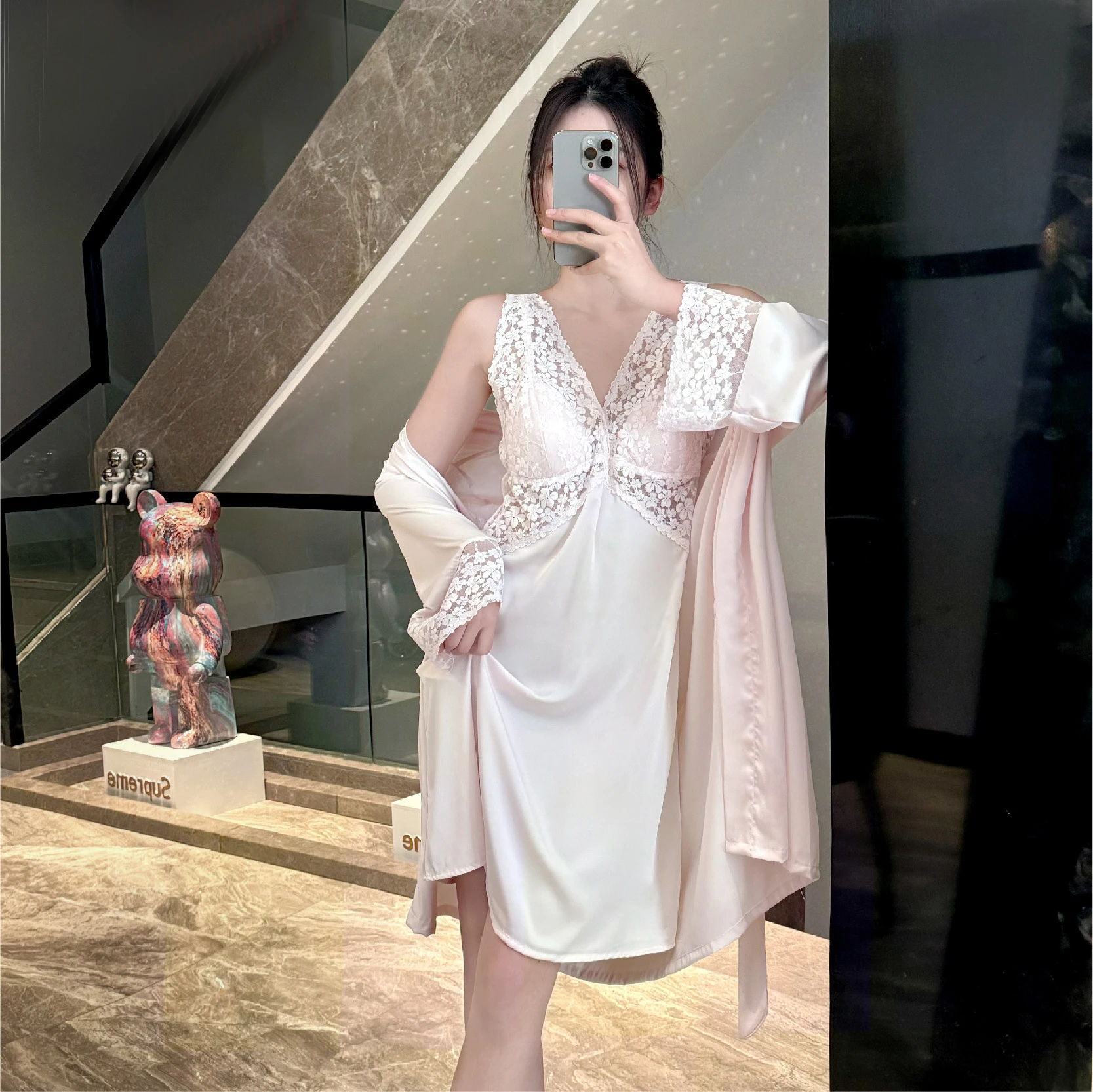 This Twinset Robe Suit combines a delicate strap nightgown with a coordinating kimono-style bathrobe for a cohesive sleepwear ensemble. Designed with lace patchwork and a lightweight, semi-sheer construction, the set offers breathable comfort ideal for warm nights and relaxed mornings. The kimono silhouette drapes easily and ties at the waist for adjustable coverage, while the nightgown features slender straps and a flattering, feminine cut.
