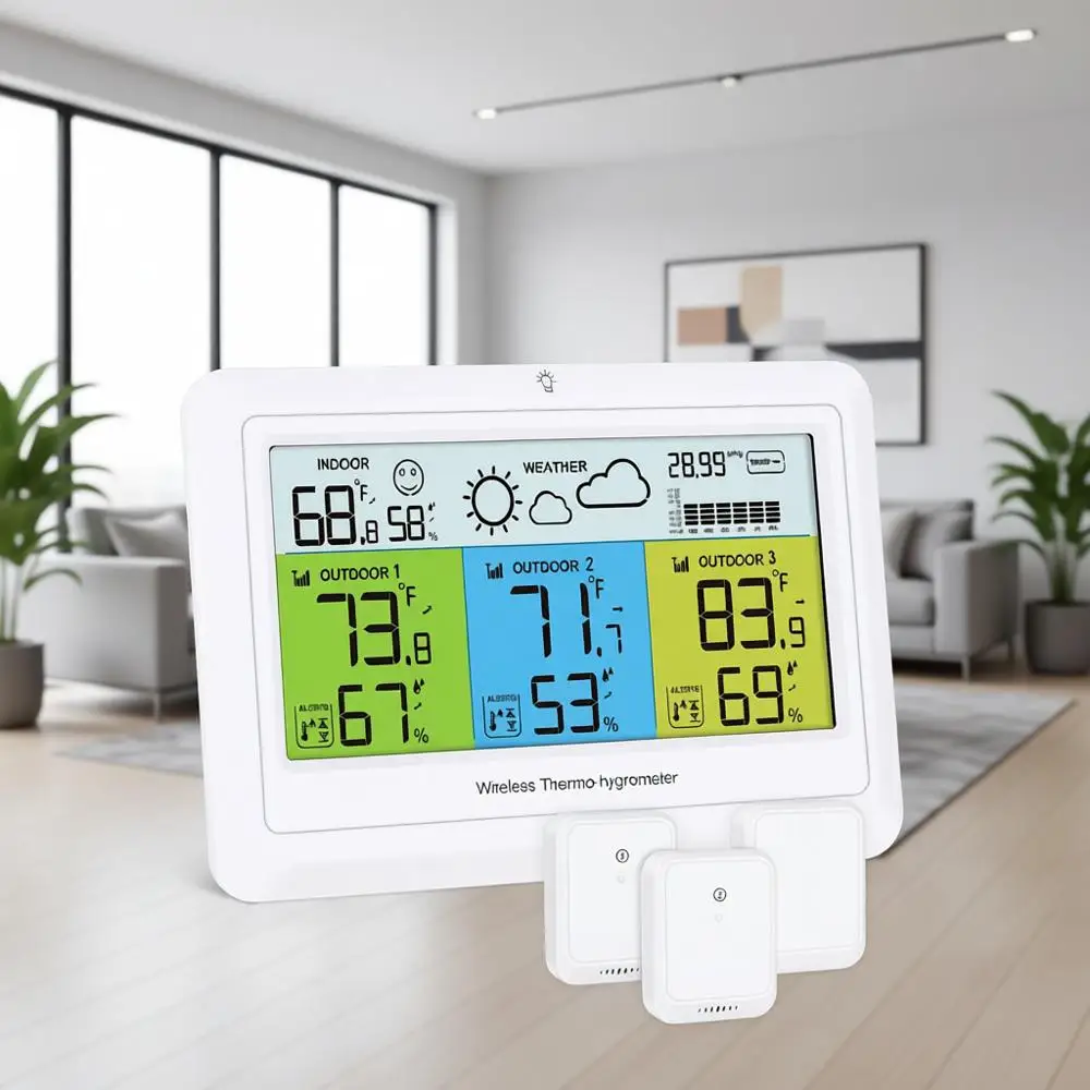 Designed for flexible placement, each sensor transmits wirelessly to the central console, and the backlit display ensures visibility day or night. Simple to set up and operate, the station organizes data logically for fast reference and helps you track environmental changes across different areas of your home or property.