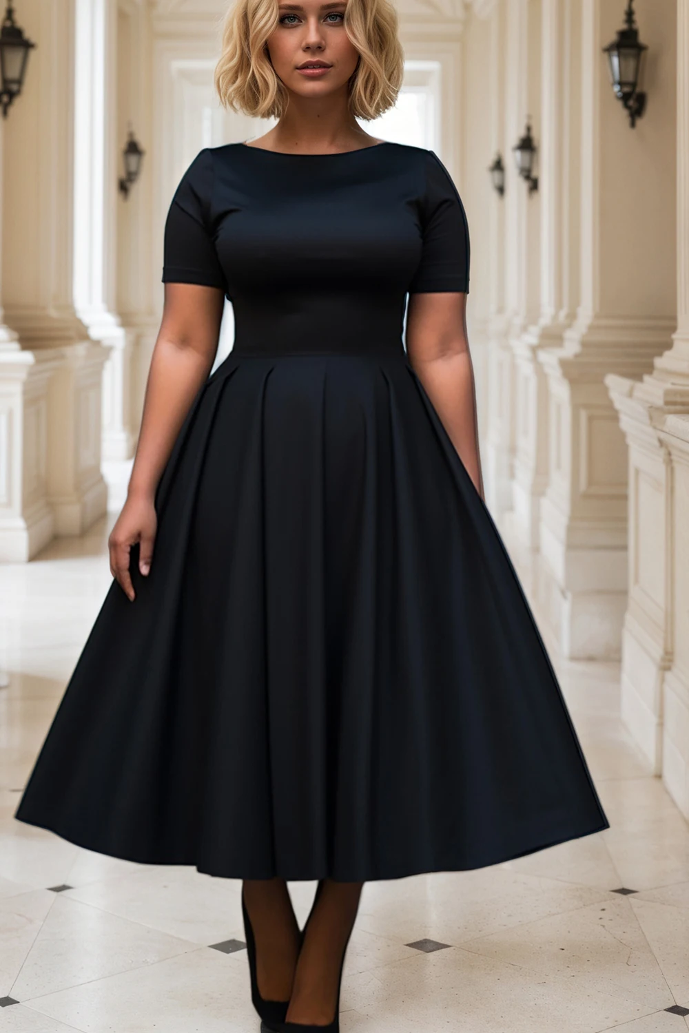 This Women Plus Size Black Dress blends effortless comfort with a timeless silhouette. Designed in a soft, breathable fabric, the short sleeves and round neck make it an easy choice for warm-weather wear. The pleated A-line cut flatters the figure while allowing graceful movement from day to evening.