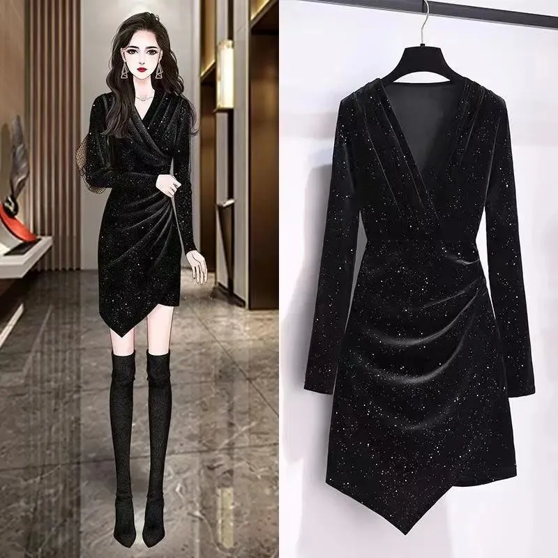 Take a look at Women’s Glitter Velvet Wrap Dress with Long Sleeves Asymmetric Hem.