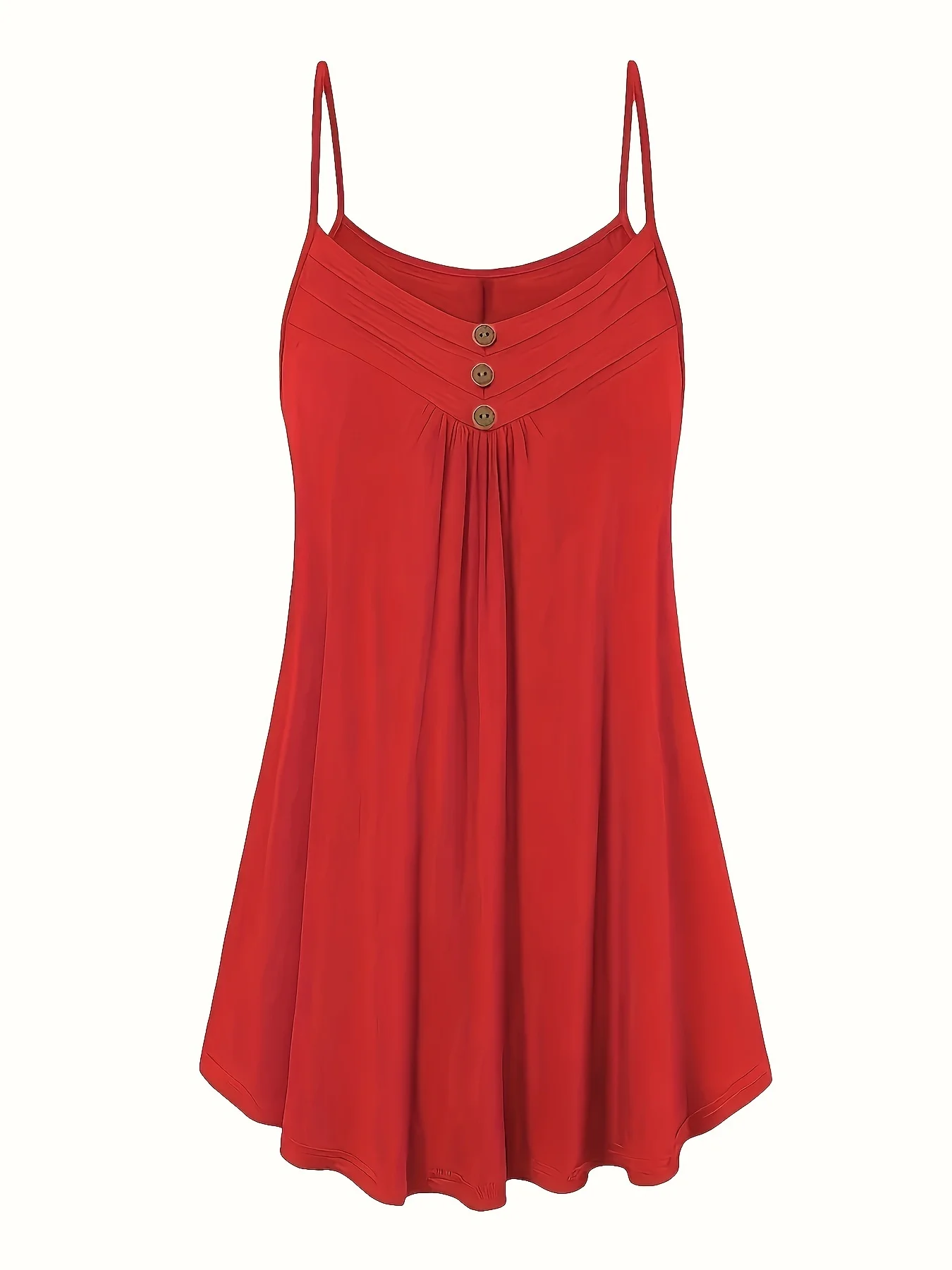 Refresh your wardrobe with the Women’s Plus Size Button Decor Pleated Cami Swing Tank Top—an easygoing piece that balances feminine detail with everyday comfort. Soft, breathable fabric and a relaxed swing silhouette provide effortless movement and flattering drape for all-day wear. Delicate pleating at the front adds texture, while decorative buttons along the neckline offer subtle visual interest without overwhelming the design.